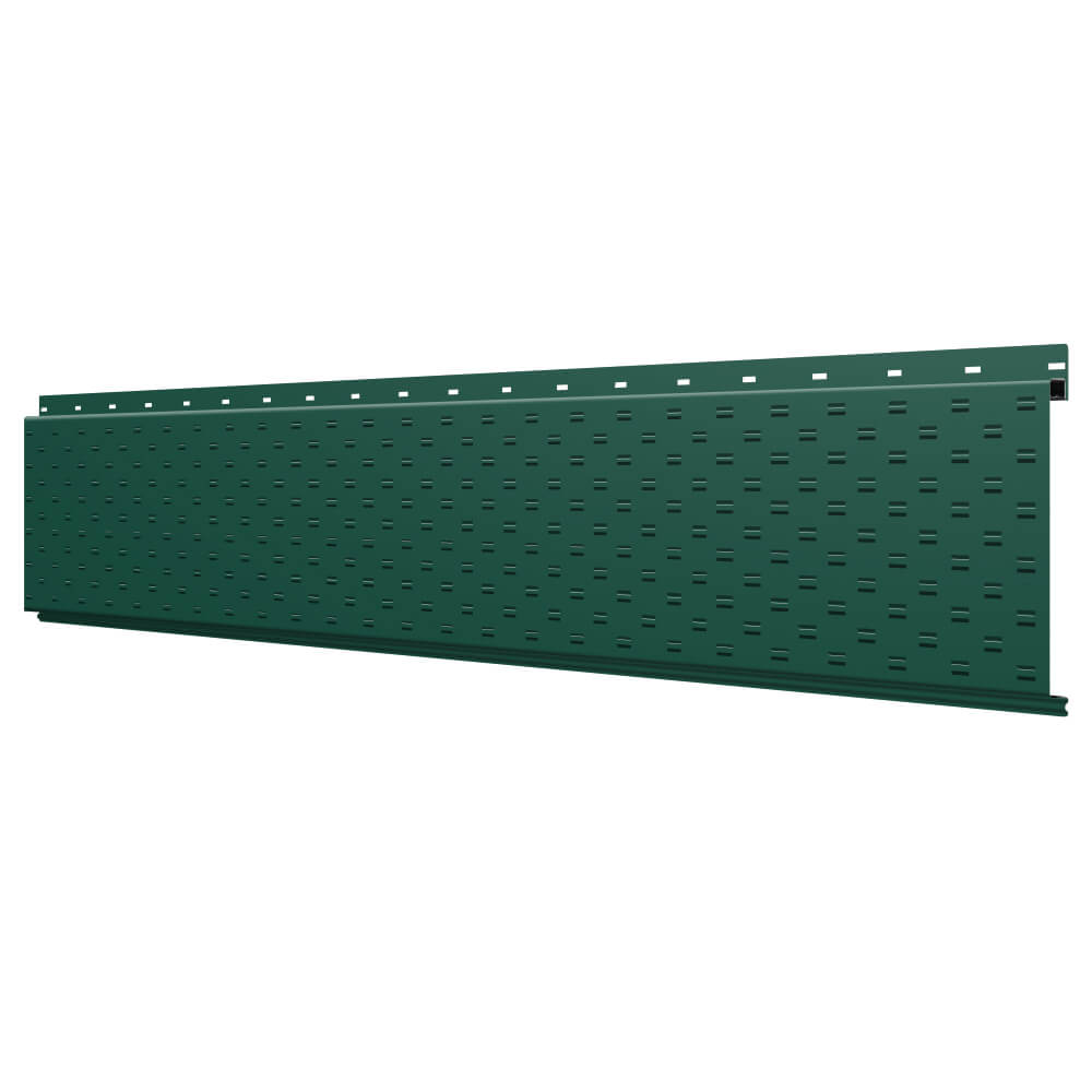 Линеарная потолочно-стеновая панель с ПЕРФОРАЦИЕЙ для вентиляции цвет RAL6005 Зеленый Мох применяется в качестве софитов для подшивы крыши, наружной и внутренней отделки потолков, стен, фронтонов фасада дома в Кызылорде.