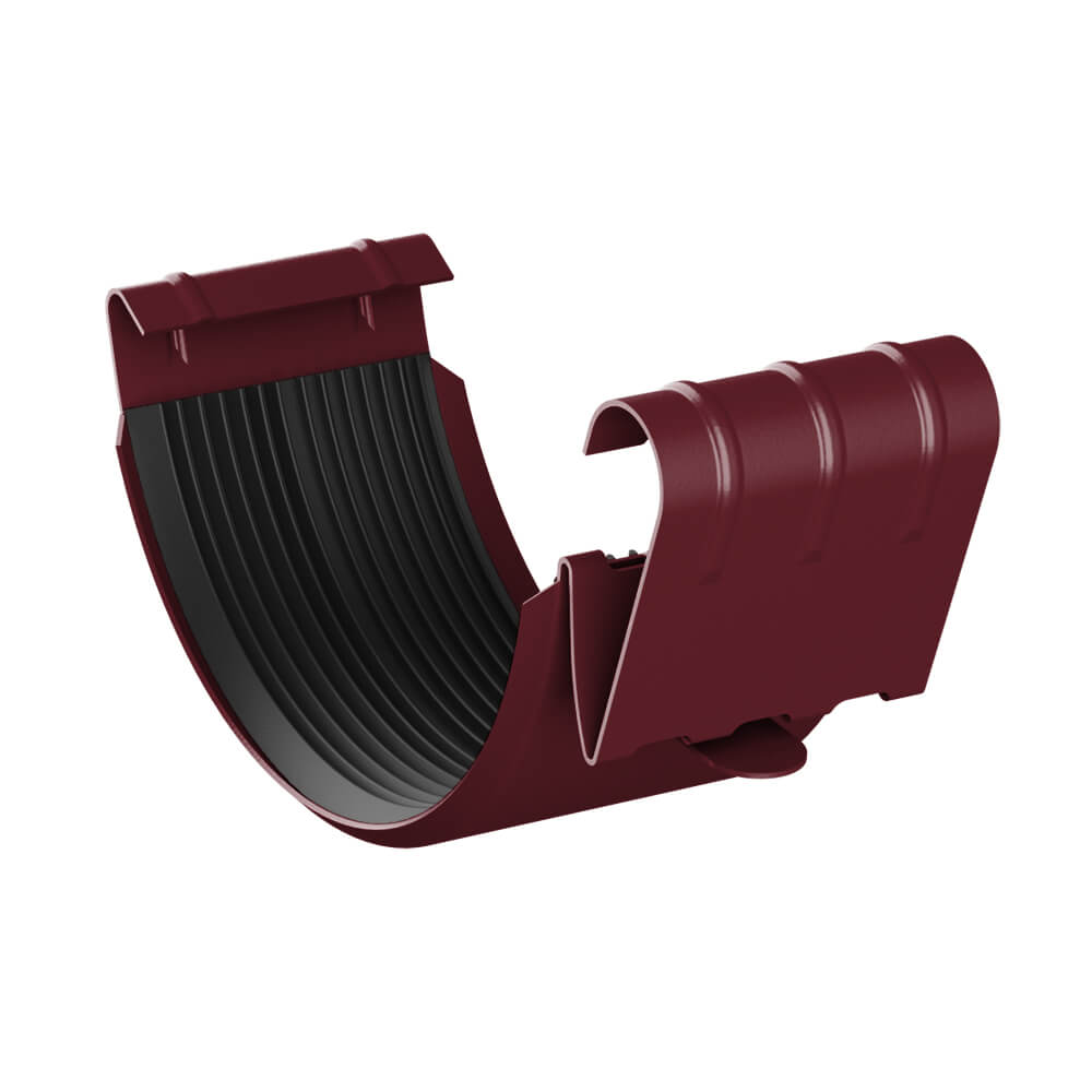 Соединитель желоба d125 водостока RAL 3005 Красное Вино металлический - обеспечивает герметичное сопряжение желобов между собой или желоба с наружными и внутренними углами. При соединении желобов между собой или с углами желоба их вставляют друг в друга с нахлёстом в 25-30 мм. На месте стыка обязательно устанавливают соединитель желоба с ЭПДМ прокладкой.