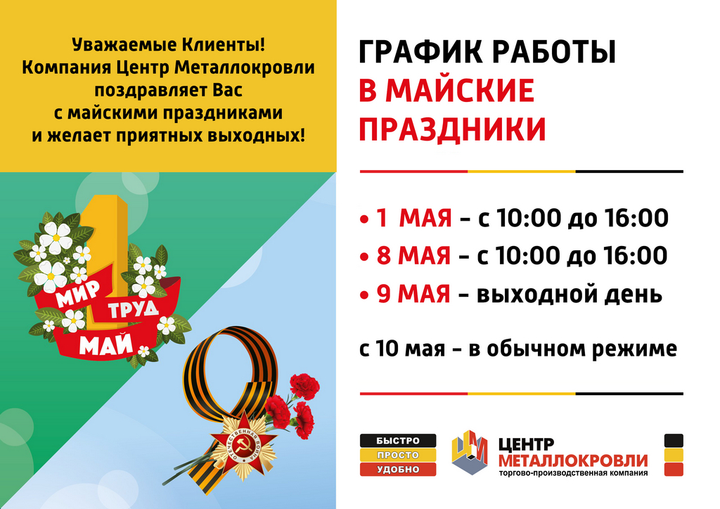 График работы ТПК «Центр Металлокровли» в майские праздники